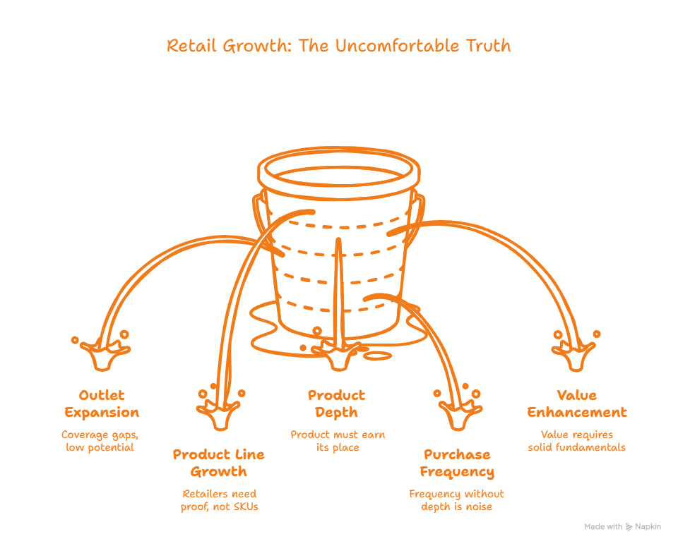 Adding more outlets means confronting coverage gaps we’ve learned to live with, retailers we never quite won over. Markets we claim are “low potential” because winning them would require real effort. Once outlets exist, pushing more things is the next test. Retailers don’t want more SKUs by default, they want proof that each one earns it’s place on the shelf. If a second or third line doesn’t come in, it’s rarely a space problem, it’s a belief problem. Driving more of each thing is even more uncomfortable. Depth exposes whether your product deserves to sit deeper on the shelf. Not whether it can be pushed, but whether it earns its place through pull.